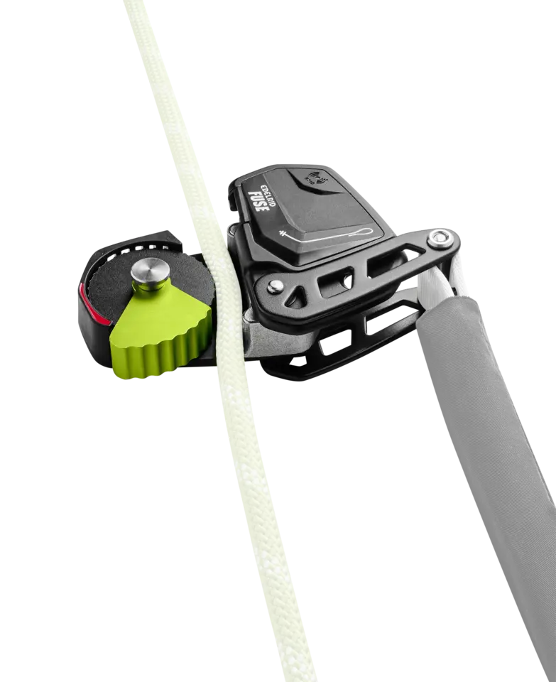 El FUSE redefine los estándares de los anticaídas guiados. Es el único dispositivo de seguridad del mercado para una carga útil de hasta 140 kg que cumple con todas las normas aplicables en Europa y Norteamérica. Desde el primer metro, se desplaza por la cuerda con una facilidad sin precedentes. Esto se consigue gracias a un nuevo y sofisticado enganche en el brazo de palanca.