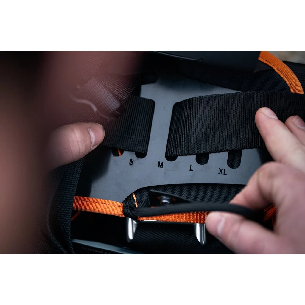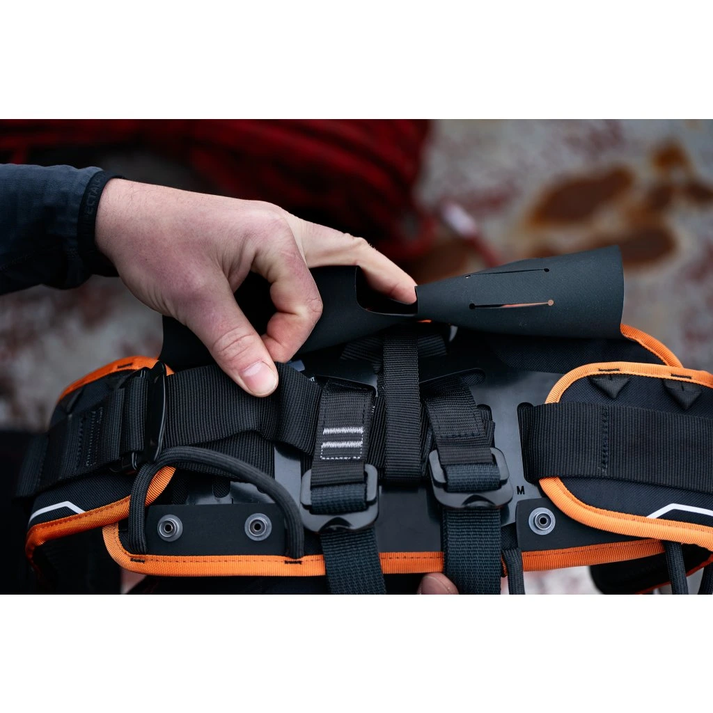 Equipado con hebillas de AL de liberación rápida para una colocación y ajuste rápidos del arnés. Los extremos sueltos de las correas de ajuste se pueden asegurar con el sistema Clip Smart. La parte trasera del Master UP se conecta al arnés de pecho mediante una anilla de acero.