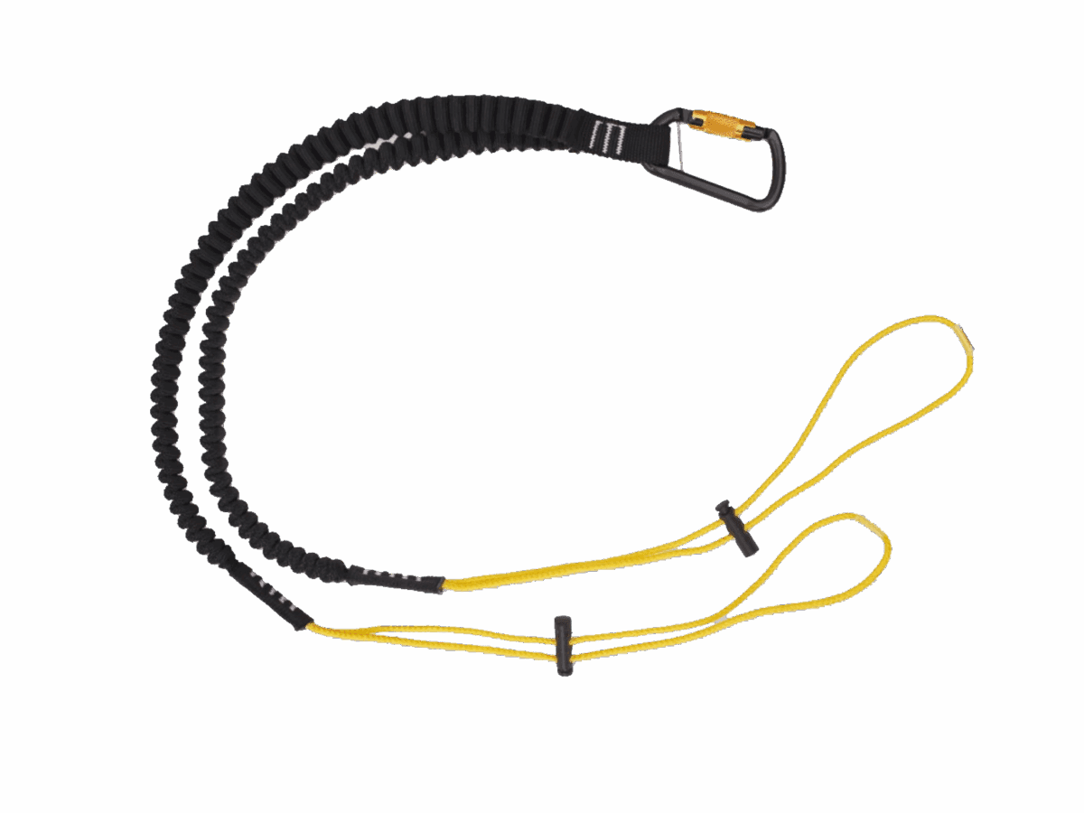 Portaherramientas elástico bifurcado con mosquetón para unir al cinturón del arnés.